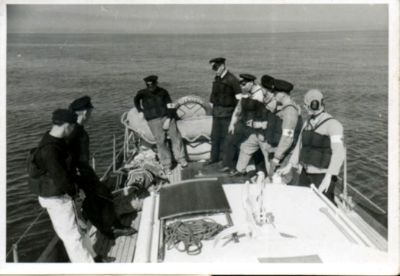 Gefallener Soldat wird von kleinem Marine Boot geborgen. Pilot ?.